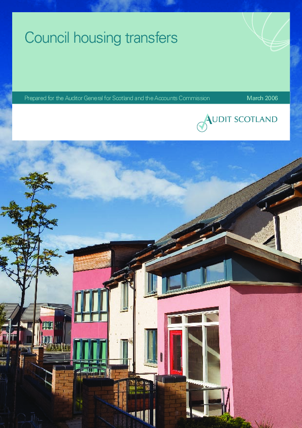 The transfer of council housing ownership is bringing benefits for tenants, says this report. It finds that management of transfers is improving but better, clearer measures are needed to assess impact and value for money. The report says the hand over of more than 100,000 council homes to new landlords since 1998 has brought more investment in properties - doubling it in Glasgow - and promoted tenant control. It is facilitating increased repairs and maintenance and the building of new homes, and is keeping rent increases down.