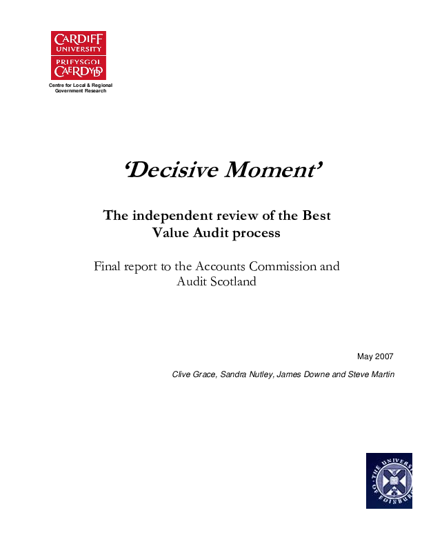 This report was commissioned by the Accounts Commission as part of its wider review of the progress of the Best Value and Community Planning council audits. The study was undertaken by a team from Cardiff and Edinburgh Universities and is based on consultation with stakeholders.