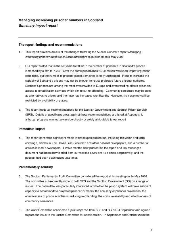 There was widespread media coverage of this report. The Scottish Parliament’s Public Audit Committee and the Justice Committee took evidence from representatives of the Scottish Government and the Scottish Prison Service and the Minister for Community Safety on the issues raised. There have been a number of significant changes in the areas the report highlighted since its publication.
