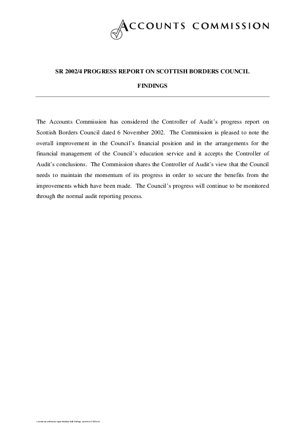 The Accounts Commission for Scotland has issued its findings on the progress made by Borders Council towards rectifying problems which resulted in a £3.9 million overspend in their education service last year. The Commission's findings have been published after the consideration of a progress report by the Controller of Audit, Ronnie Hinds.