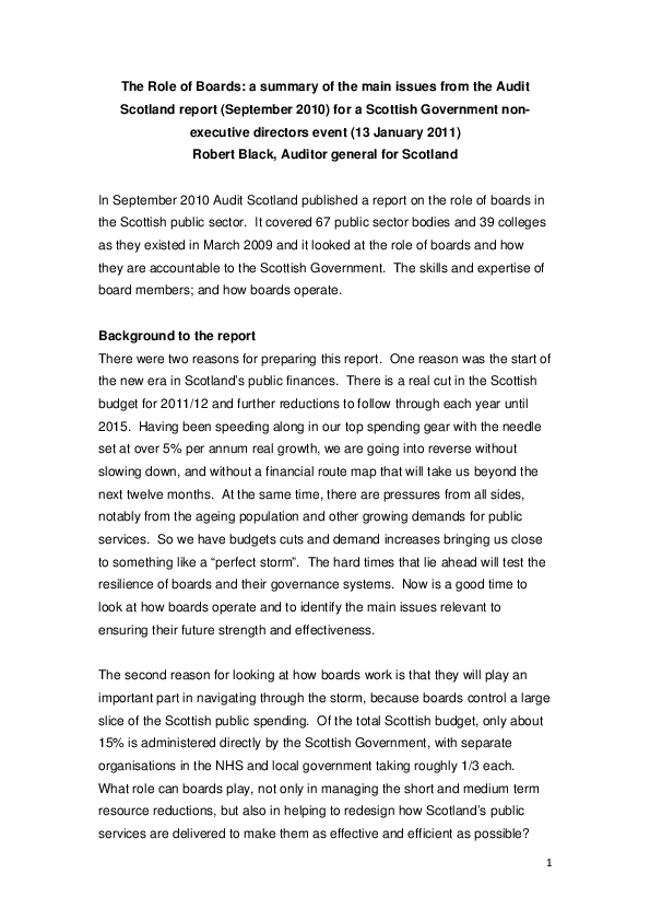 In September 2010, Audit Scotland published a report on the role of boards in the Scottish public sector. It covered 67 public sector bodies and 39 colleges as they existed in March 2009, and it looked at the role of boards and how they are accountable to the Scottish Government; the skills and expertise of board members; and how boards operate.