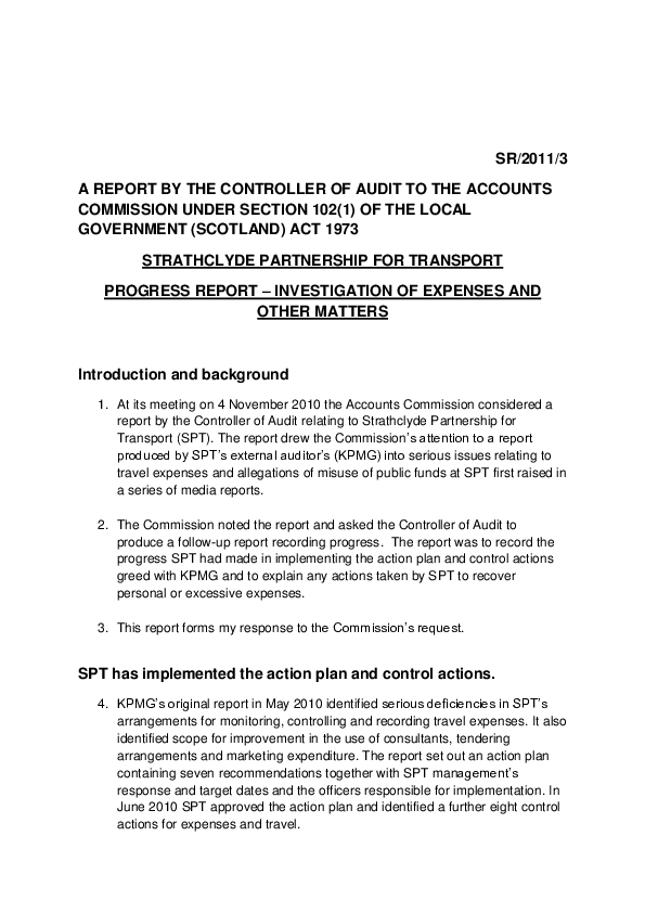 Reviewing an update report on an audit investigation of travel expenses and other matters, the Commission welcomes improvements made by SPT. The regional transport authority has made significant progress against its action plan.