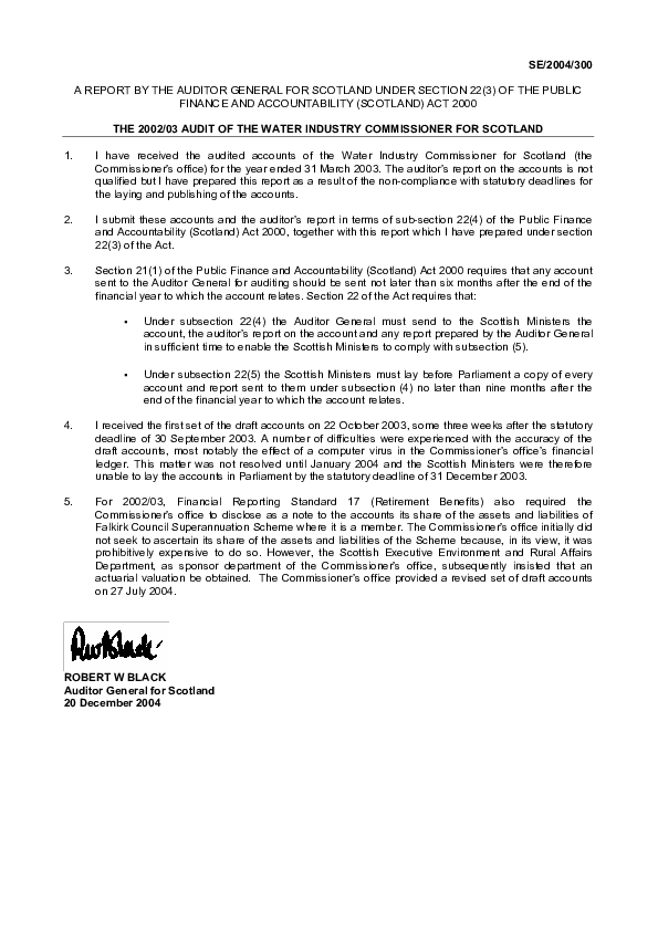 Report: The 2002/03 audit of the Water Industry Commissioner for Scotland