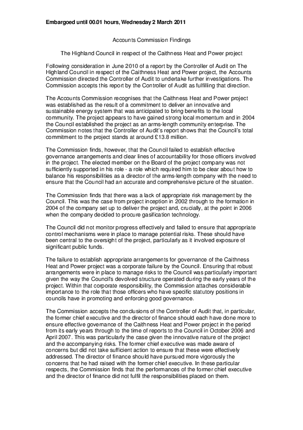 The Commission decided that in light of the concerns highlighted in the Controller of Audit’s (CoA) June 2010 statutory report, it required a further report with more evidence. This was considered in February 2011 and the Commission then published its findings.